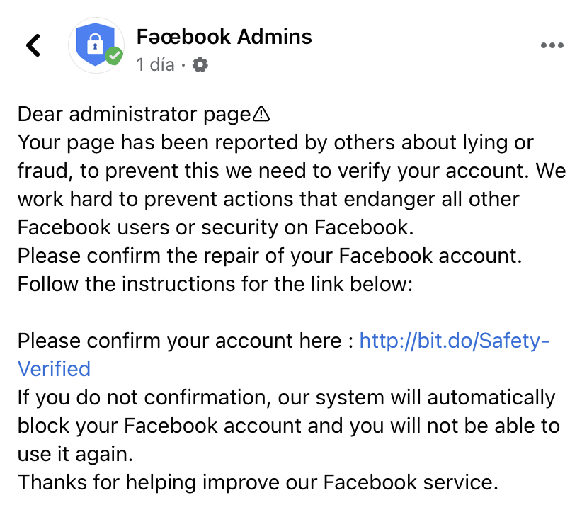 Como ves es una cuenta que intenta “suplantar” a la empresa Facebook con un nombre “parecido” y donde te piden pinchar en un enlace para cambiar la contraseña. Si lo haces, estás perdido. 👇🏻👇🏻👇🏻👇🏻